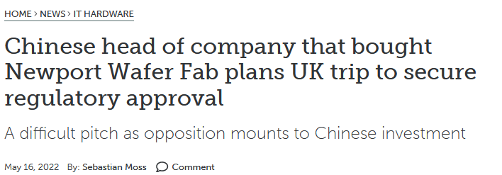 在4月21日,据华盛顿时报报道,美国国会一个旨在反击“中国威胁”的特别工作组于4月19日致信美国总统拜登,以可能威胁国家安全的理由,呼吁拜登政府阻止将英国最大半导体制造商NWF晶圆工厂出售给一家中国公司的子公司安世半导体的计划。