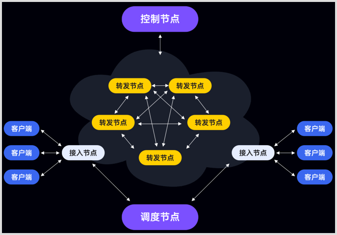 转发节点:核心转发模块,两两之间实时探测,组成 full-mesh 的网络,上报 rtt,loss,jitter 等信息