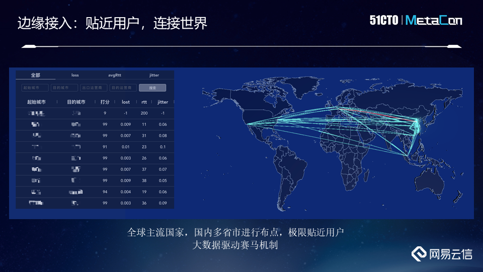 解决用户接入最直接的方法就是让边缘服务器离用户更近。因此,网易云信在全球主流国家和国内多个省市都进行了边缘布点。同时,每日对所有服务器进行网络质量梳理,启动服务器间的“赛马机制”,以此保证优质的服务器能极限贴近用户。