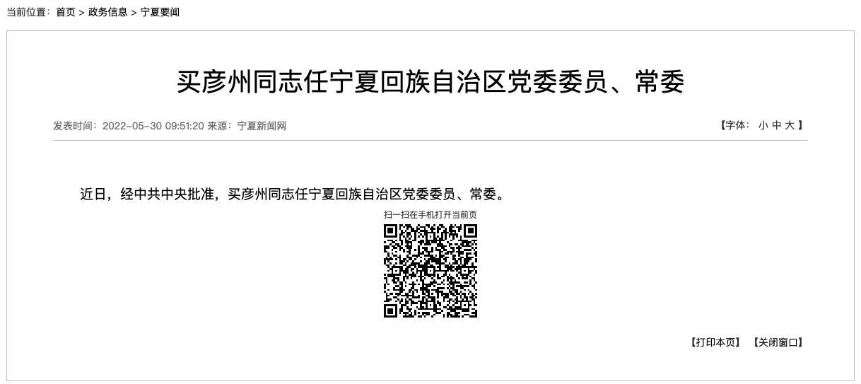 C114讯 5月30日消息(林想)据宁夏自治区政府网消息,近日,经中共中央批准,买彦州同志任宁夏回族自治区党委委员、常委。