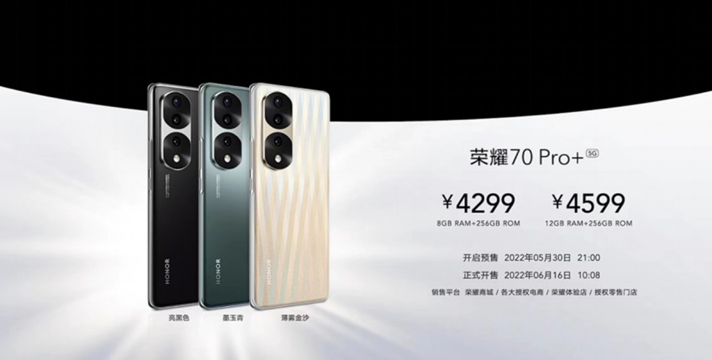 C114讯 5月30日消息(安迪)荣耀今晚正式发布荣耀70系列三款机型——荣耀70、荣耀70 Pro、荣耀70 Pro+,售价分别为2699元起、3699元起、4299元起。