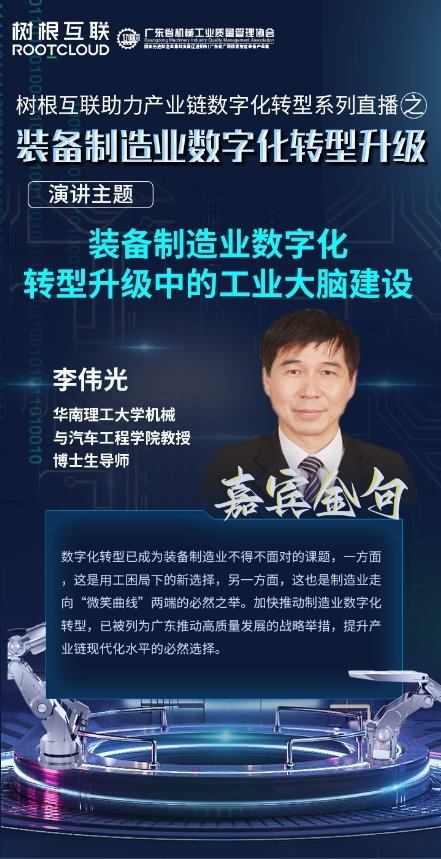 6月29日,在广州市“链长制”办公室(广州市工业和信息化局)的指导下,树根互联联合广东省机械工业质量管理协会,举办树根互联助力产业链数字化转型系列直播之“装备制造业数字化转型升级”活动。会上,树根互联、华南理工、科达装备的专家学者,在线上为行业观众分享了自身对于装备制造业数字化转型的思考。