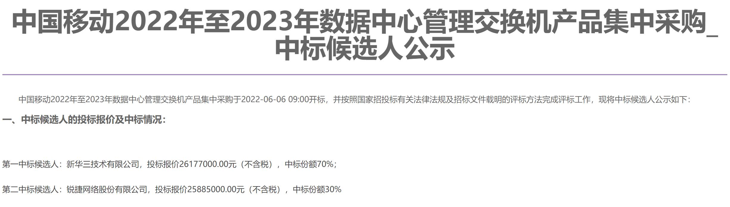 C114讯 7月1日消息(九九)中国移动2022年至2023年数据中心管理交换机产品集中采购中标候选人公示,新华三、锐捷入围。