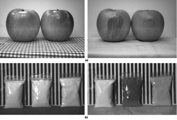 图1 短波红外成像可以看到以往不可见的细节,如擦伤或表皮以下部分。我们比较了可见光(如图a左图)和短波红外传感器捕获的图像,结果发现只有短波红外图像可显示出苹果的瘀伤和缺陷(如图a右图)。同时不同化学物质以高度特定的波长吸收短波红外波段,从而产生独特的吸收光谱。因此利用短波红外成像可识别食物中的污染物。图b左图由可见光传感器拍摄(图b右图由短波红外传感器拍摄),图b中从左至右的物质分别为盐、糖和土豆淀粉。