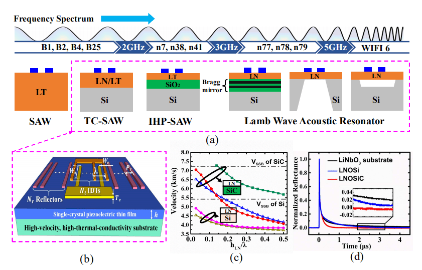 图1(a)SAW滤波器向高频、大宽带方向发展的路线图;(b)基于高声速、高导热压电异质衬底的滤波器芯片示意图;图(b)所示压电异质衬底的(c)声速频散特性曲线仿真结果和(d)瞬态热反射曲线测试结果