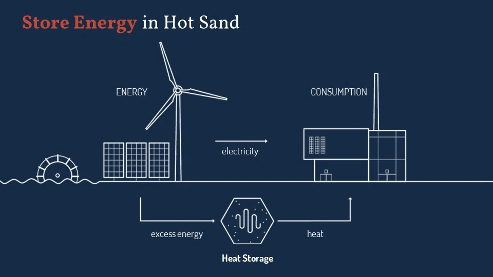 据了解,沙子能在500-600℃左右的温度下储存几个月时间,因此夏季产生的电力可以在冬季用于加热家庭。Polar Night Energy称它有100kW的加热能力和8MWh的能源容量。以下是它是如何跟可再生能源一起运转的: