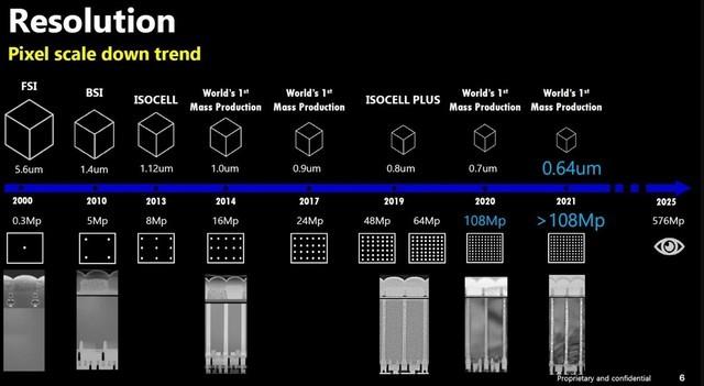该幻灯片显示了自2000年以来三星旗下CMOS像素大小和分辨率趋势的概况。