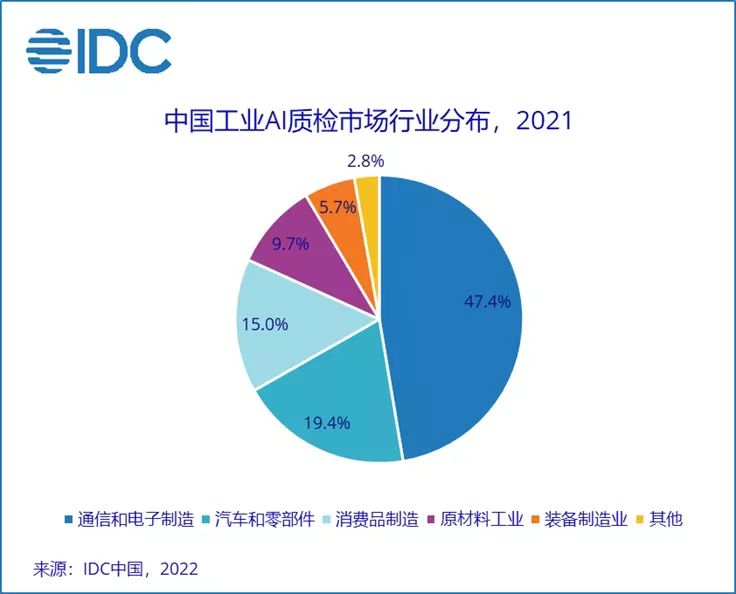 IDC同时指出,工业AI质检已经从前几年的试点应用,走向规模化复制推广。通信和电子制造、汽车及零部件、消费品和原材料4个行业是目前工业AI质检的主要应用行业,合计占据了91.5%的市场空间。4个重点行业贡献了目前AI质检主要的规模化应用场景,但新的应用场景也在持续涌现。