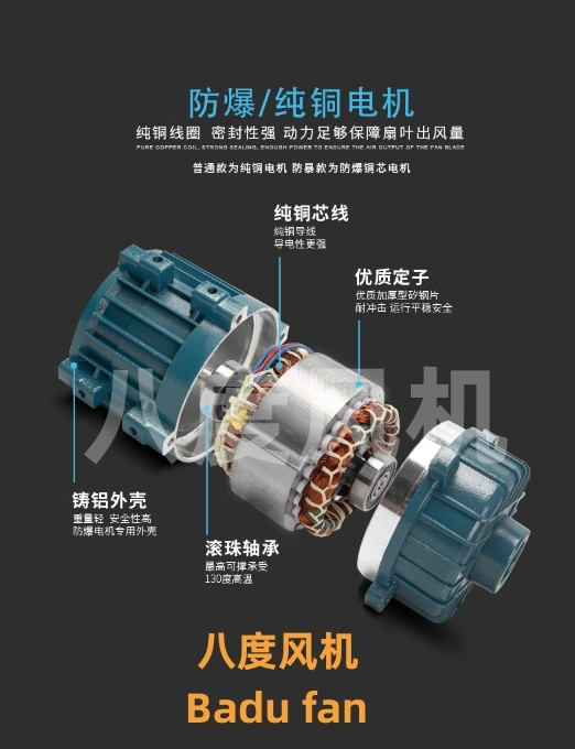 3.风机根据使用环境不同要求,风机可制成防爆轴流风机,可适用于非腐蚀的含有易燃、易爆气体的场所,防爆等级为EXdⅡBT4。
