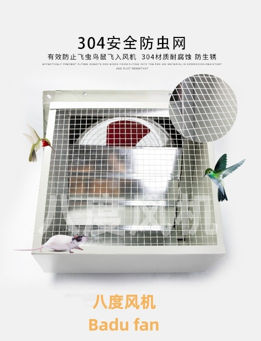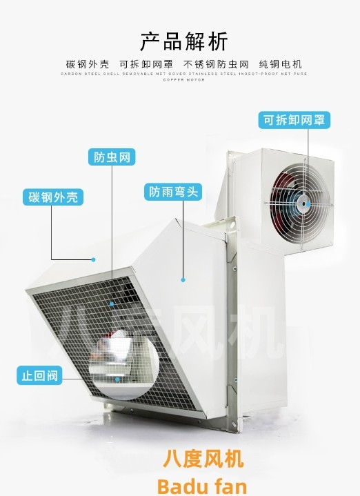 边墙式风机一般用于边墙壁式排风,配设45°防雨罩(或特殊制造成60°)和防虫网(夜间可防止昆虫循灯光飞入车间),配设90°防雨罩(防风、雨、尘)和防虫网(夜间可防止昆虫循灯光飞入车间)。附件选配:重力式止回风阀(可确保车间在风机不开时保持与室外隔绝),订货时注明。