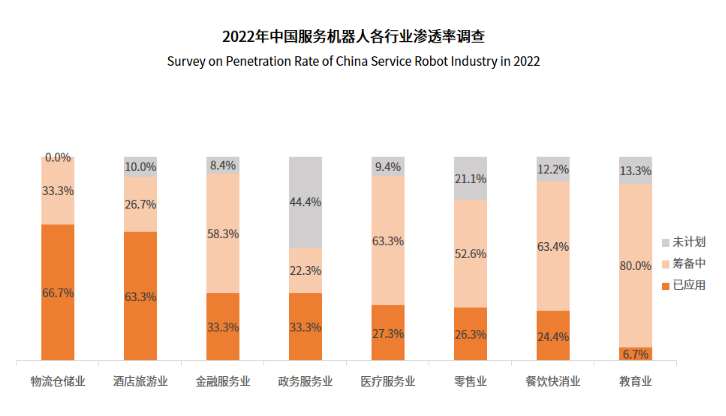在商用服务机器人中,物流仓储业和酒店旅游业是目前服务业中机器人渗透率最高的行业,在受访企业用户中应用比例均超过六成。在主要行业的机器人使用情况中,金融业、医疗业、教育业、餐饮业都在大力筹备应用服务机器人。政务服务行业在已使用和筹备使用机器人的占比较低,与其政务相关工作内容具有复杂性、高灵活性以及较高的保密安全性要求有关。