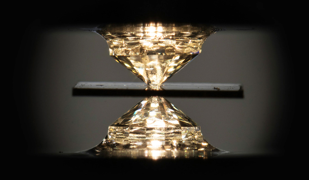当一对金刚石砧之间加压时,一种由氢、碳和硫组成的新型金属化合物在21摄氏度下表现出超导性