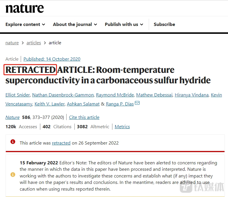 Dias所在团队的论文于2022年9月26日被《自然》撤稿