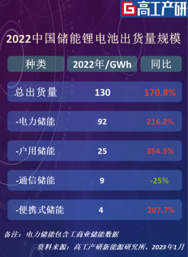 在过去的2022年,中国储能产业依然保持着高速发展的态势。据GGII最新数据统计,2022年国内储能锂电池总出货量达到130GWh,同比增速达170.8%。其中,电力储能电池出货量为92GWh;户用储能电池出货量为25GWh;通信储能电池出货量为9GWh;便携式储能电池出货量为4GWh。