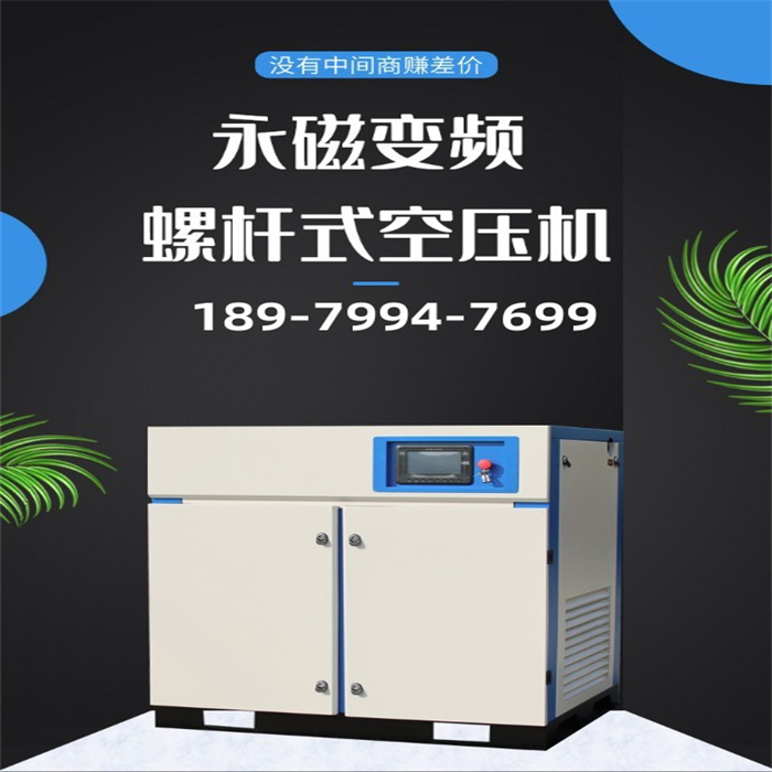 永磁变频空压机的原理是依赖于永磁同步电机稀土,永磁变频空压机的工作原理与电励磁同步电机相同,前者是以永磁体替代励磁绕组进行励磁。当永磁电机的三相定子绕组(各相差120°电角度)通入频率为f的三相交流电后,将产生一个以同步转速推移的旋转磁场。稳态情况下,主极磁场随着旋转磁场同步转动,因此转子转速亦是同步转速,定子旋转磁场恒与永磁体建立的主极磁场保持相对静止,它们之间相互作用并产生电磁转矩,驱动电机旋转并进行 能效转换。永磁变频空压机采用永磁稀土永磁同步电机,螺杆主机与永磁电机共用同一根主轴,电机没有轴承,带有永磁体的转子直接安装在阳转子的伸出轴上。这种结构解决了传统电机轴承,实现电机免维护。变频空压机(低噪节能)