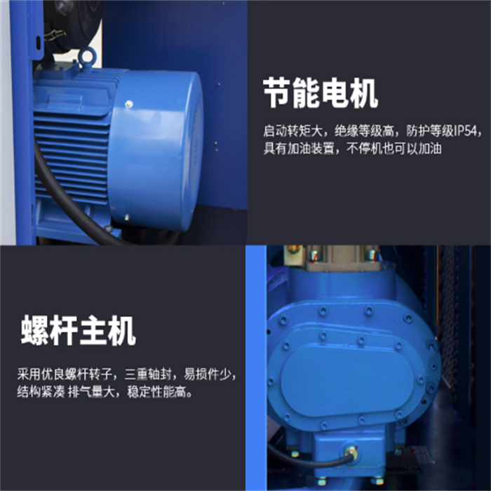 7、 永磁变频螺杆空压机采用稀土永磁同步电机,120℃不失磁,寿命达10年。永磁变频空压机的螺杆主机和电机共用同一根主轴,不需要皮带、联轴器,传动效率。电机无轴承,较为耐用,少维护。永磁变频空气压缩机