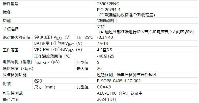 TB9032FNG结合了电机控制设备(MCD)和CXPI通信,并提供了车载应用的网络接口或区域电子控制单元(ECU)的接口[5]。它可以支持控制门锁和后视镜控制等功能。