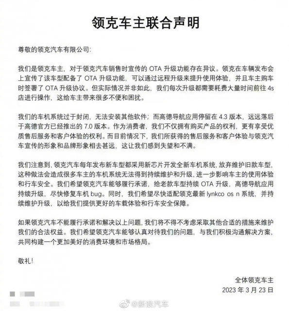 从联合声明中可以了解到,领克在车辆发布会上宣传了该车型配备了 OTA 升级功能,可以通过远程升级来提升使用体验,并且车主购车时签署了 OTA 升级协议。但车主每次升级都需要耗费大量时间前往 4S店进行操作,这给车主带来很多不便和困扰。