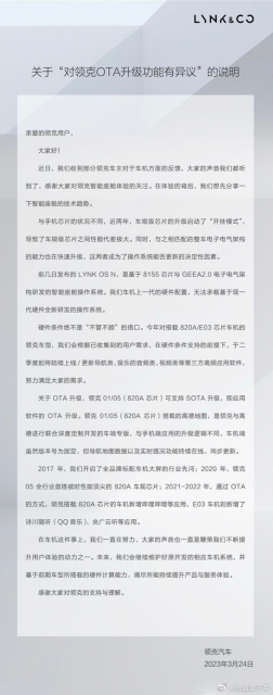 对此,领克汽车在3月24日发布说明表示,近两年车规级芯片升级非常快,导致了车规级芯片之间性能代差极大,同时与之相匹配的整车电子电气架构的能力也在快速开级,这两者成为了操作系统能否更新的决定性因素。