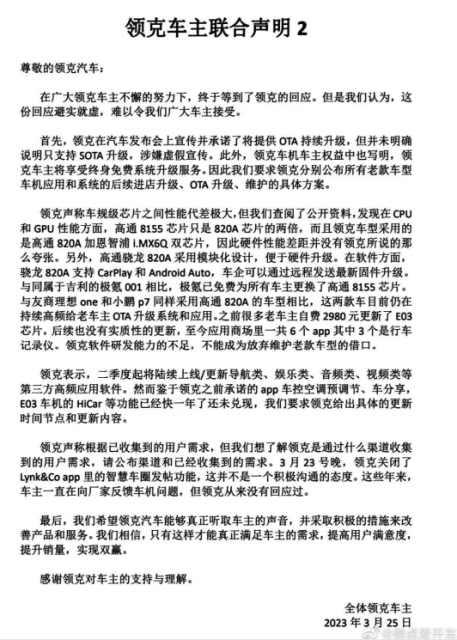 车主在声明中还表示,这些年来车主一直在向厂家反馈车机问题,但领克从来没有回应过。我们希望领克汽车能够真正听取车主的声音,并采取积极的措施来改善产品和服务。