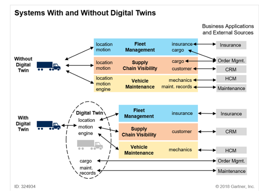 Gartner采用面向对象的方法,将数字孪生定义为:一个数字孪生是,一种真实世界实体或系统的数字表示。一个数字孪生的实现,是一个封装好的软件对象或模型,其镜像了一个唯一的物理对象特征,或一个唯一的物理对象集合。其给出了一个使用数字孪生与不使用数字孪生的例子,如下图。从第一性原理的思路来看,就是面向对象与非面向对象方法或技术的区别。但这与其将数字孪生连续列入了2017-2019年度的十大战略性技的壮举反差极大。