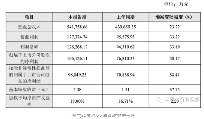 2022年扬杰科技实现营业收入54亿元,较上年同期增长23.22%,归属于上市公司股东的净利润10.6亿元,较上年同期增长38.17%。主要原因是:1)公司持续加大新产品研发投入,不断开发出具有市场竞争力的高附加值产品,新产品的业绩表现突出。IGBT、MOSFET、小信号等产品线均实现了大幅增长,SiC 产品线研发取得重大突破。2)公司大力布局清洁能源和汽车电子市场,汽车电子方面,陆续获得多家海内外著名汽车零部件企业认可,并在全系列产品上逐步开始批量交付;清洁能源方面,在进一步巩固和扩大传统光伏应用领域优势,与多家行业 TOP 客户建立战略合作的同时,进一步拓展光伏逆变、储能等新领域,研发投入和产能布局得到大幅增加,推动 2022 年销售收入实现高速增长。3)公司持续践行国际化战略布局,形成国内与国际双循环和双轮驱动的格局。