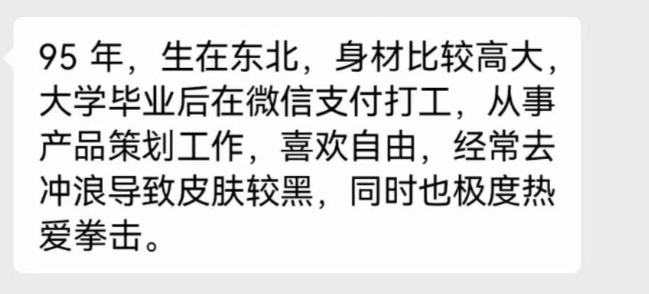 AI公司“文因互联”的市场负责人 @余姗 ,她的自我描述是“162高,55kg,在一家科技公司做市场负责人,她喜欢笑,总是手舞足蹈,会瑜伽,看着疯疯癫癫,长卷发,白色的吊带沙滩裙”,她还说: