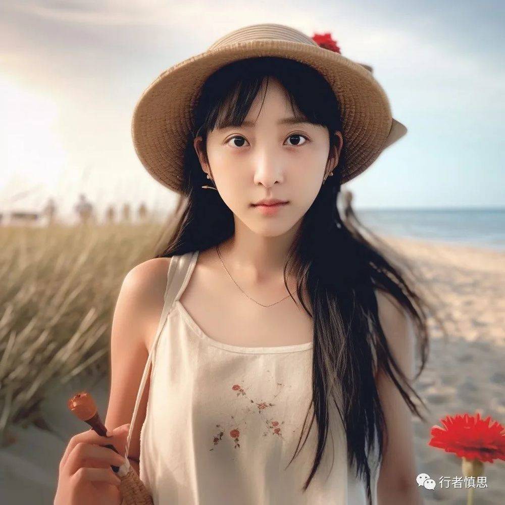 A realistic photo by Canon camera, focus on the Chinese girl's face, the girl is walking on the beach, and she has a pitch of flower on her right hand https://s.mj.run/SSwfJSEgYV --v 5