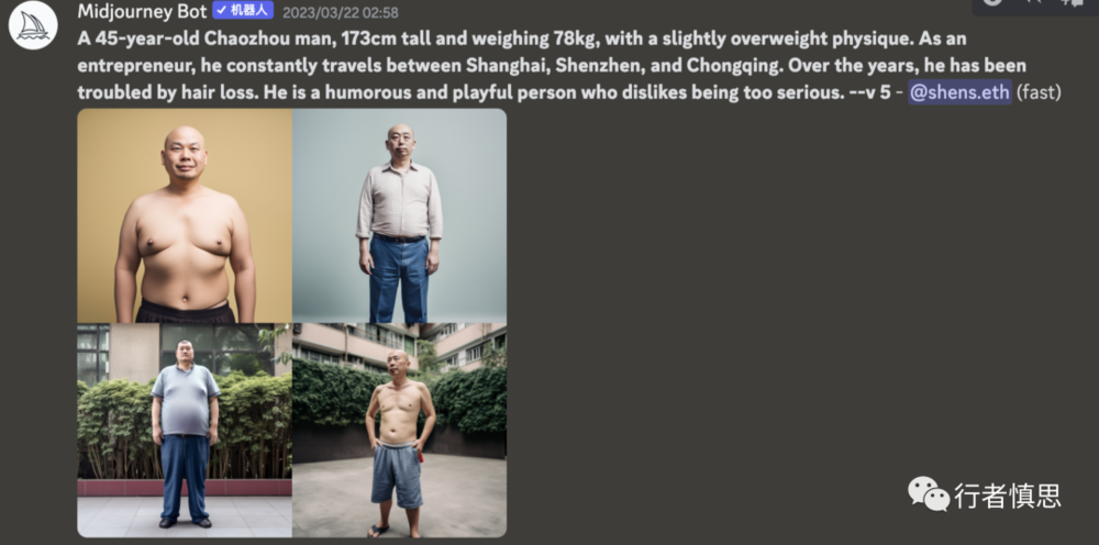 这里要说明一下,虽然我在prompt中要求“do not change his face”,但其实提供给Midjourney的照片,它只会提取其元素,然后加入到关键词中去生成,而不会真的去将人脸取出来一模一样地合并到图中。它生成图片的命令叫/imagine(想象),解读其字面意思也就比较好理解了。
