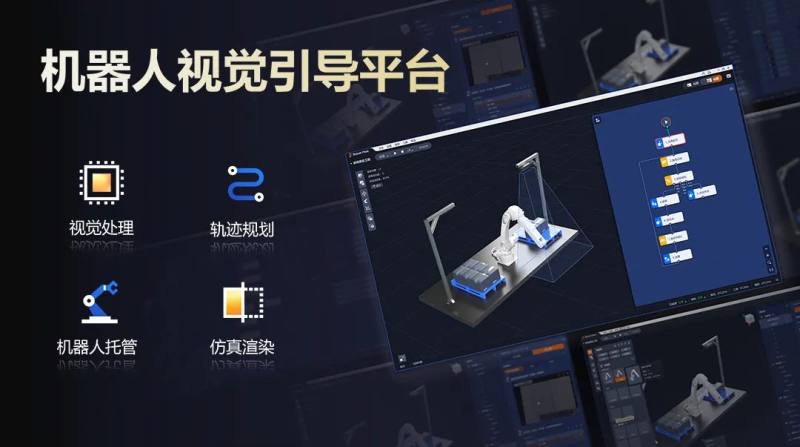 在软件方面,机器人视觉引导平台迭代至V2.0版本,视觉处理、轨迹规划、机器人托管、仿真渲染四大功能组件都更加强大,可为更多客户搭建机器人应用方案提供支撑。