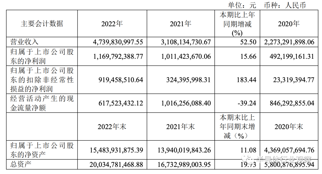 2022年公司实现营业收入 27 亿元,较2021年同期增长 58.53%,实现归属于上市公司股东的净利润 8 亿元,较2021年同期增长 105.24%。同时,公司主营业务收入在各细分行业均实现稳步增长: