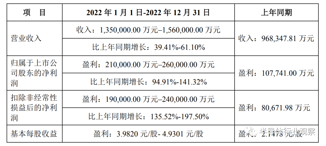 据北方华创发布的2022年度业绩预告显示,预计2022年度营收区间为 135~156 亿元,同比增长 39.41%~61.10%;净利润 21~26 亿元,同比增长 94.91%~141.32%。对于取得高速增长的原因是:公司积极采取多项措施,克服了疫情及供应链等不利因素的影响,保障了生产经营的正常运行,实现客户订单有序交付,全年电子工艺装备和电子元器件业务经营业绩均实现了持续增长。