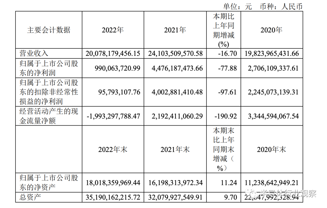 2022年公司实现营业总收入 200.78 亿元,较2021年减少 16.70%。归属于上市公司股东的净利润下跌 77.88%,归属于上市公司股东的扣除非经常性损益的净利润下跌高达 97.61%。其中半导体设计业务收入实现 164.07 亿元,占主营业务收入的比例为 82.15%,较上年减少 19.49%;公司半导体分销业务实现收入 35.65 亿元,占公司主营业务收入的 17.85%,较上年减少 2.60%。