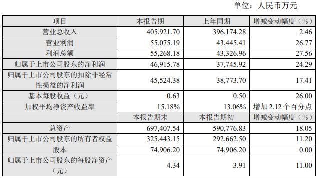 报告期末,公司总资产697,407.54万元,较上年同期增长18.05%;归属于上市公司股东的所有者权益325,443.15万元,较上年同期增长11.20%。