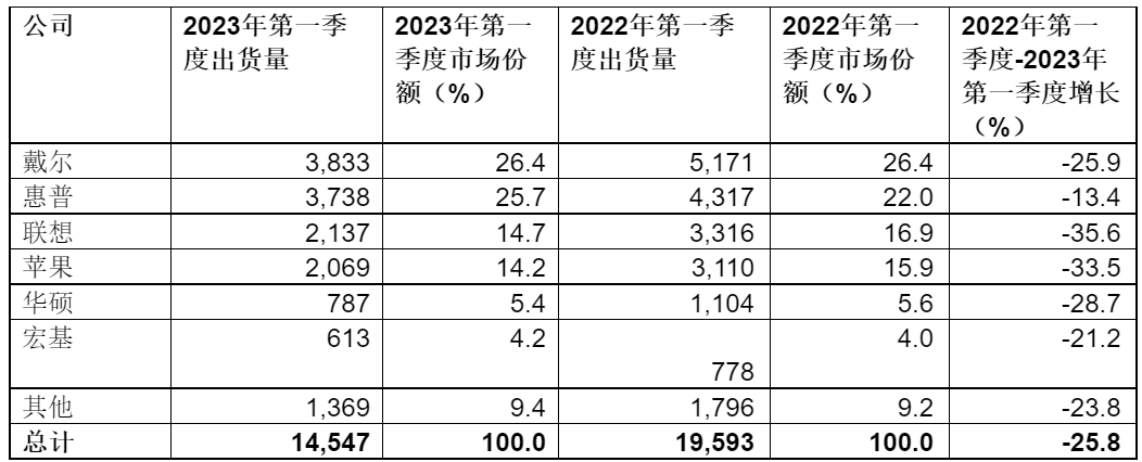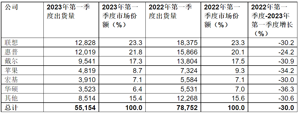 表一、2023年第一季度全球PC厂商单位出货量初步估算值(单位:千台)