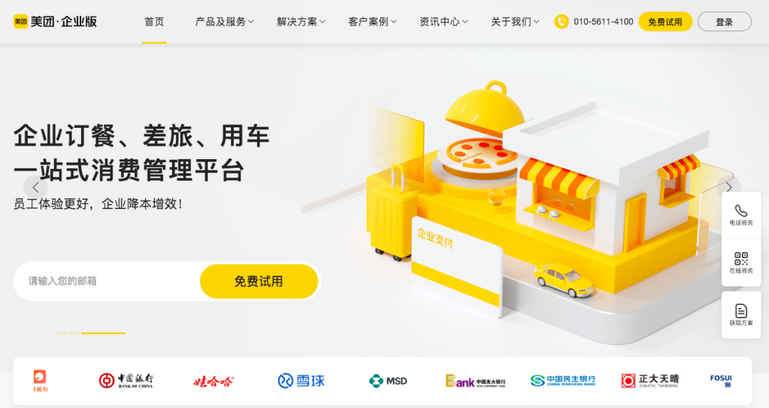 如今,美团试图在企业消费市场复制这套逻辑。以企业用餐为口子,实则涵盖工作餐、商务宴请、企业差旅、企业用车等多元场景服务。