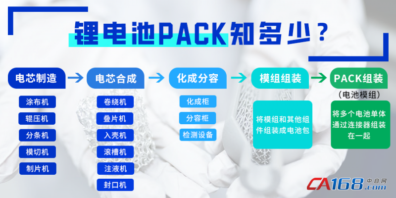 锂电池电芯组装成组的过程称为PACK,PACK自动化生产线可以实现将单体电池通过串联与并联得到高电压和高容量电池组。