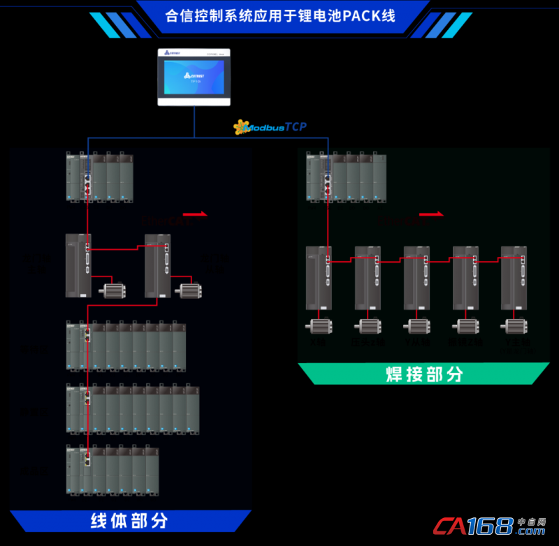 同样采用合信CTH300-C系列C56高性能CPU进行主控,通过EtherCAT高速实时总线控制5套A4N伺服驱动系统对焊接的多轴实现高速实时控制。