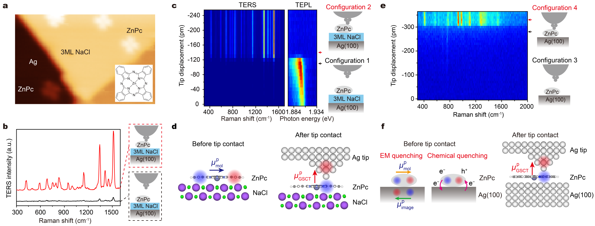 他们发现,当针尖与氯化钠表面单个平面型ZnPc分子进行“弱”的点接触时,TERS信号会被显著增强,与此同时,针尖增强光致荧光(tip-enhanced photoluminescence, TEPL)信号迅速猝灭。TERS和TEPL信号演化表明针尖与分子之间的接触产生了化学相互作用。他们对此提出一种新的物理化学联合作用机制,即针尖与分子的点接触会产生基态电荷转移过程,在与表面垂直的方向上诱导出可观的拉曼极化率,而且该垂直极化偶极还会进一步与纳腔等离激元的垂直电场耦合产生增强的拉曼信号。这种新的增强机制不仅超越了传统的纯化学效应机制,而且也不同于之前普遍认为的在化学增强过程中占主导地位的共振电荷转移机制。另一方面,当分子与金属衬底进行“强”的面接触后,TERS信号严重猝灭,特别是对于分子的面内振动信号。结合DFT理论计算表明,这是由于分子与金属衬底之间的轨道杂化引起的动态界面电荷转移以及表面电磁场屏蔽效应所导致的拉曼极化率的减弱,并且前者起主导作用。但是,通过进一步与针尖产生“弱”的点接触,猝灭的拉曼信号能够被有效“拯救”,这同样是因为上面所提及的基态电荷转移诱导的物理化学机制的联合作用所致。需要强调的是,如果分子与金属衬底的相互作用很弱(例如物理吸附的情况),或者分子垂直吸附在金属表面,这时由于动态界面电荷转移诱导的拉曼极化率的减弱效应会变得很小,预计将不会出现拉曼猝灭现象。