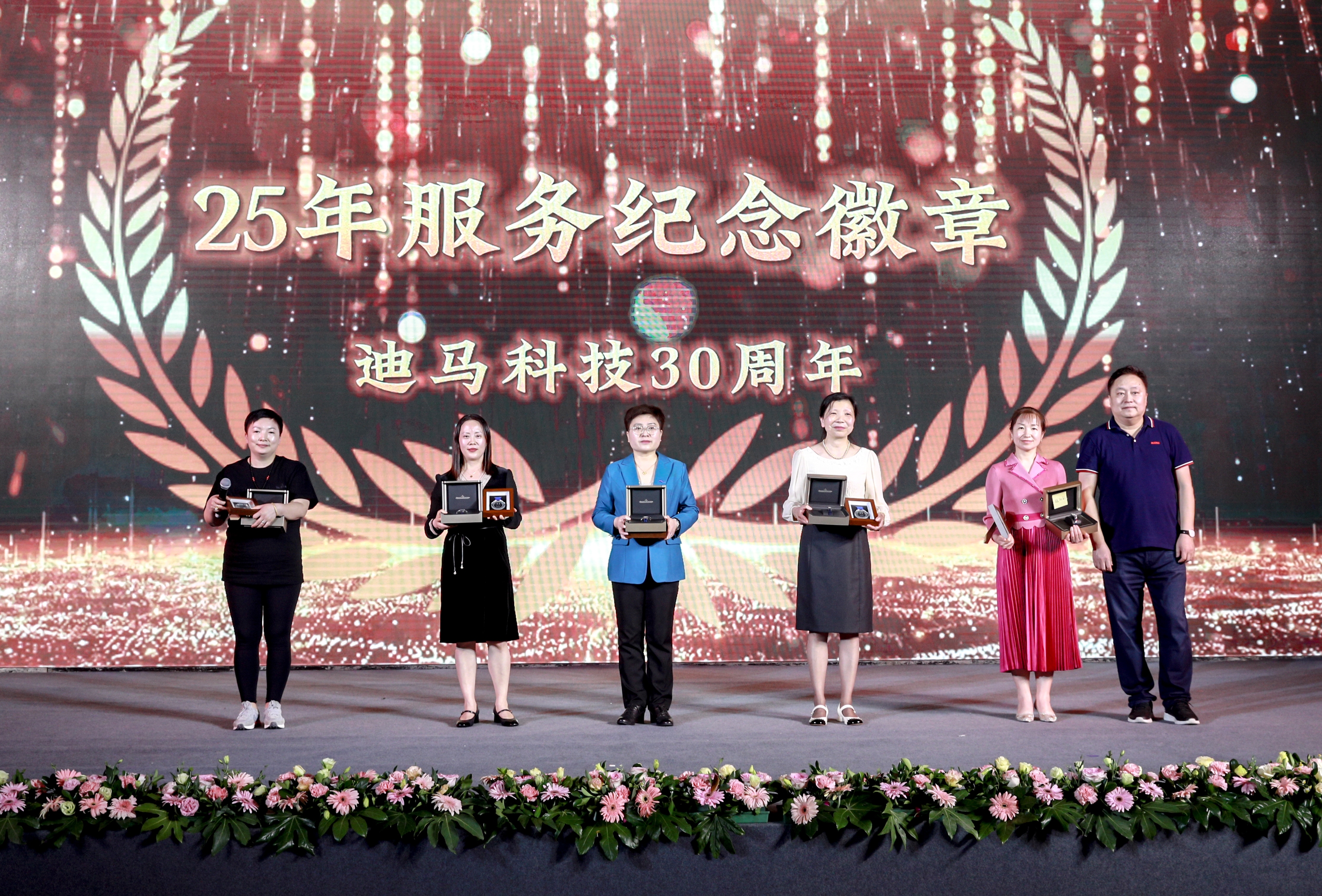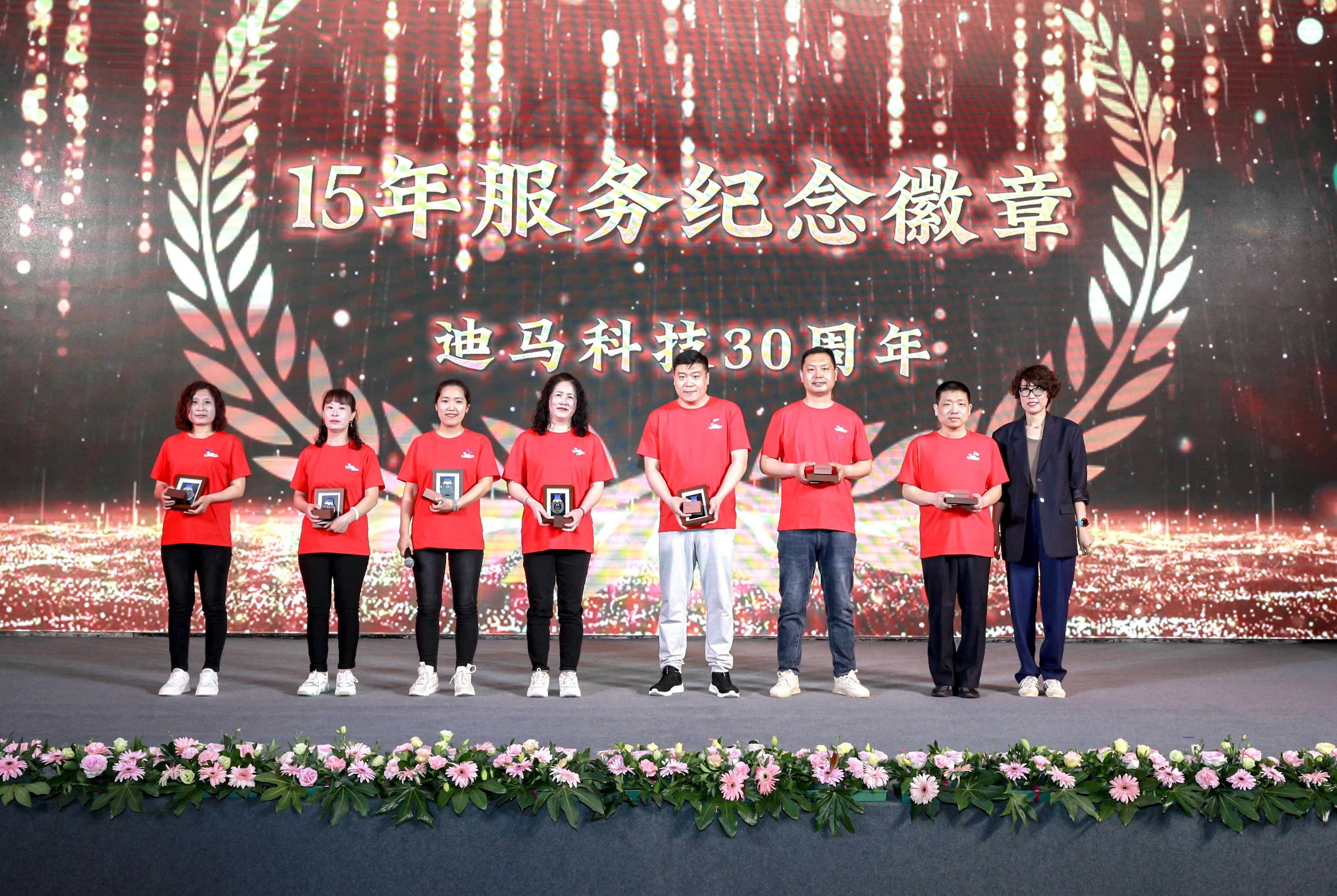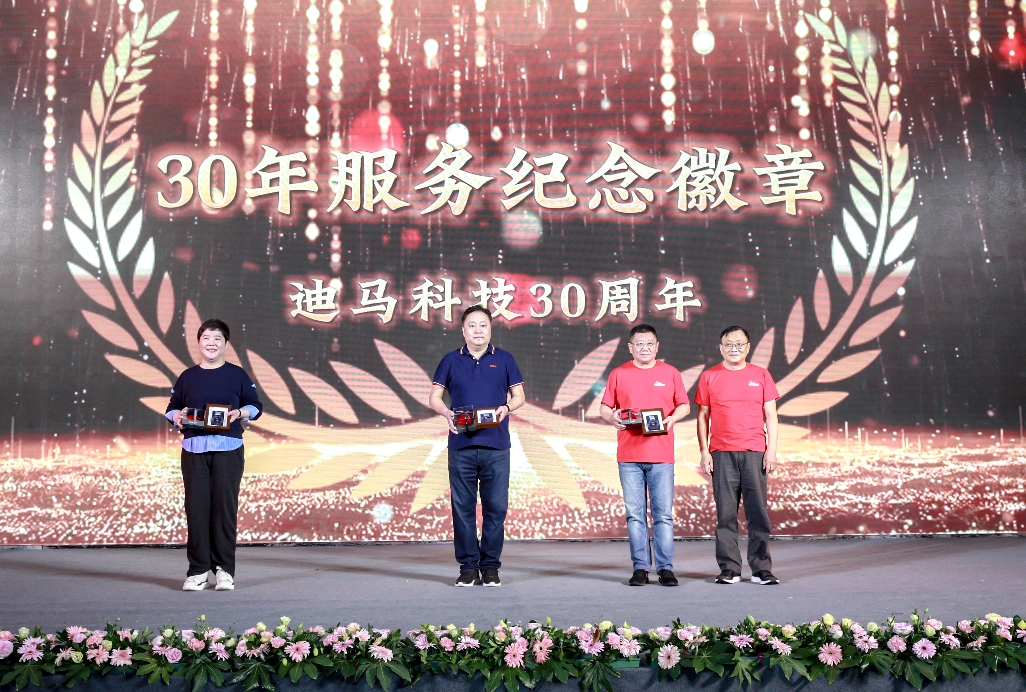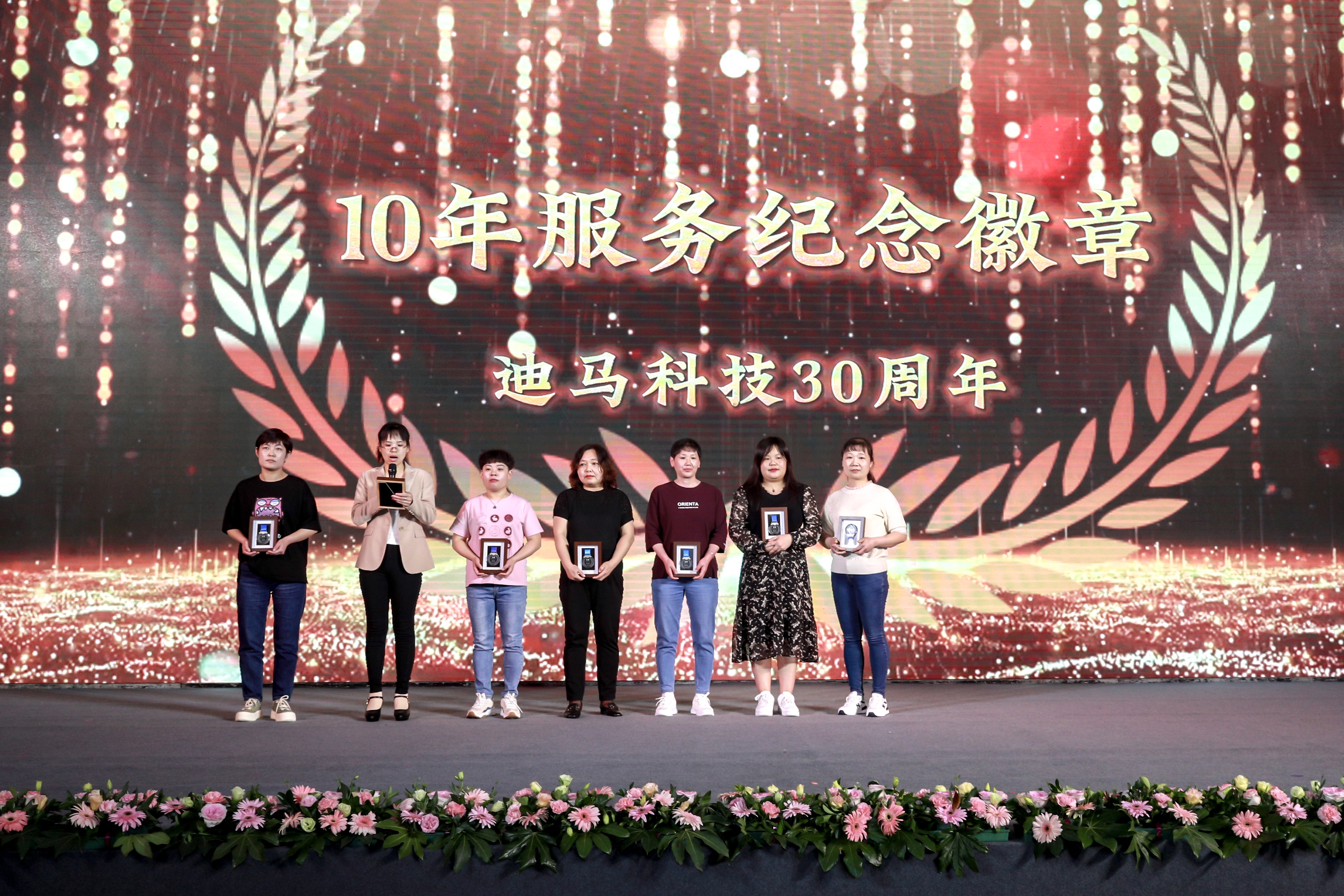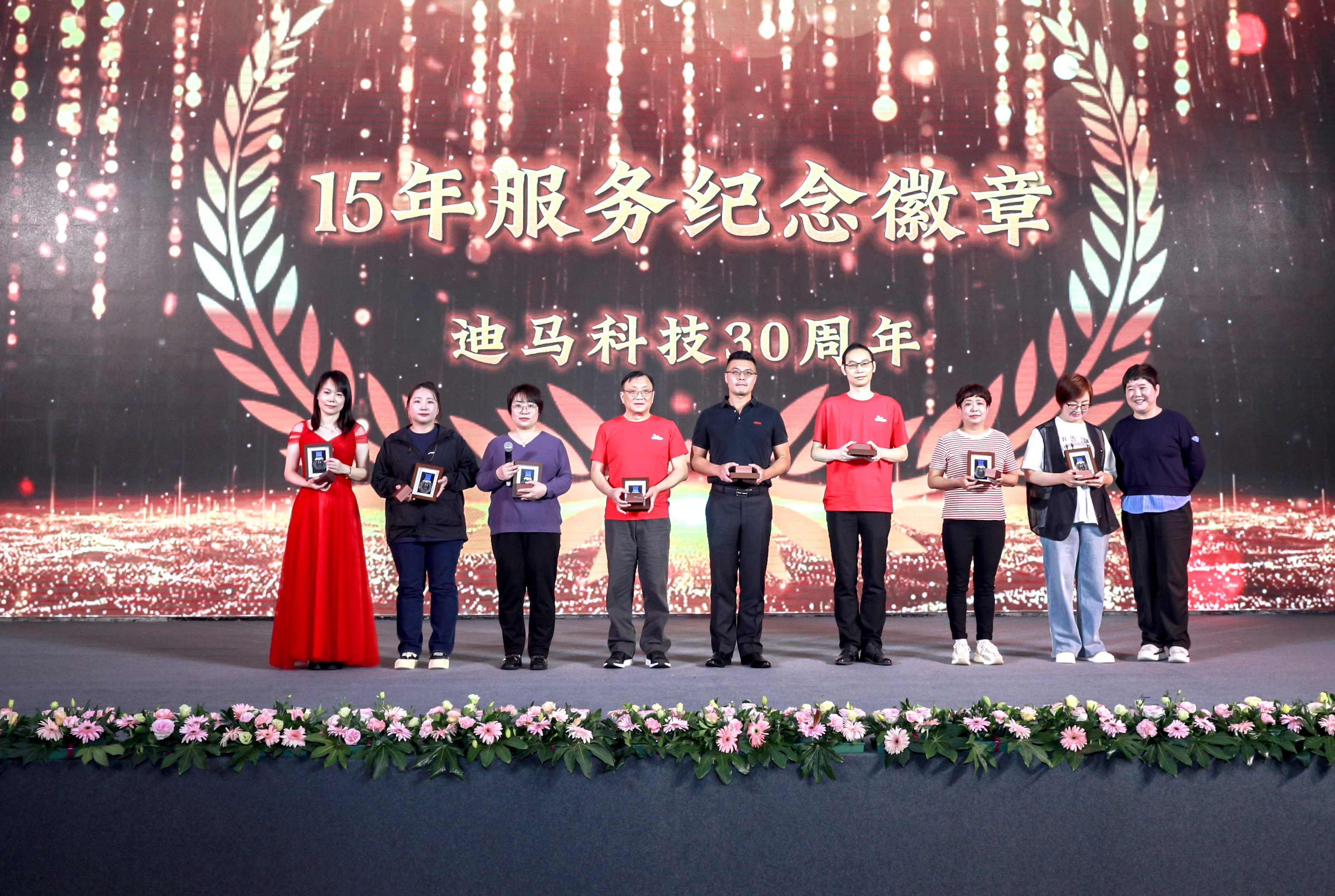 庆典节目和颁奖穿插进行。颁奖典礼上,从入职三年、五年到十年、十五年再到二十、二十五、三十年的员工比比皆是。一枚枚服务徽章记录着迪马人与公司风雨同舟。迪马科技特意为老员工们送上徽章、铂金戒指、钻石戒指、积家手表、永生花等含有特殊意义的礼品。