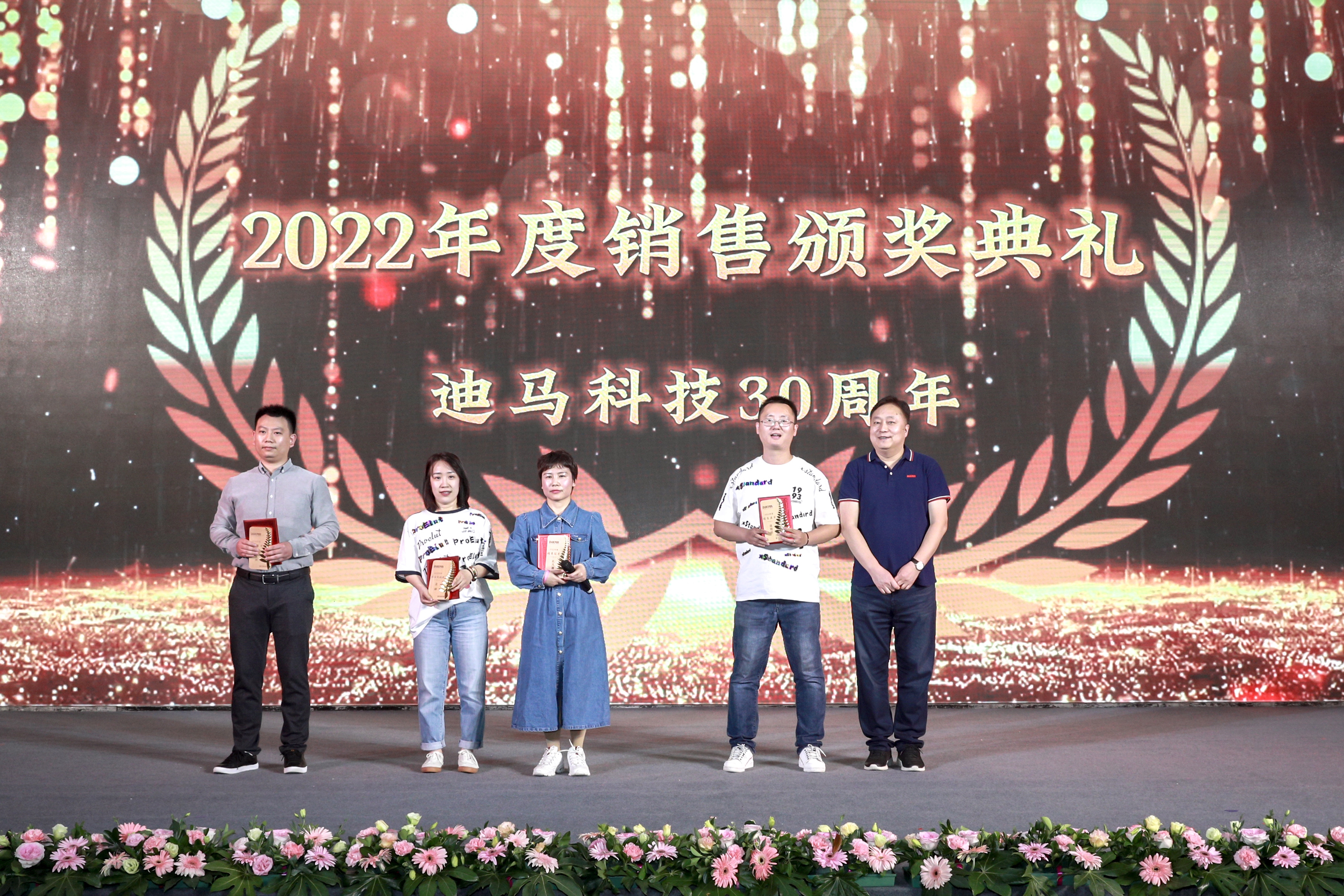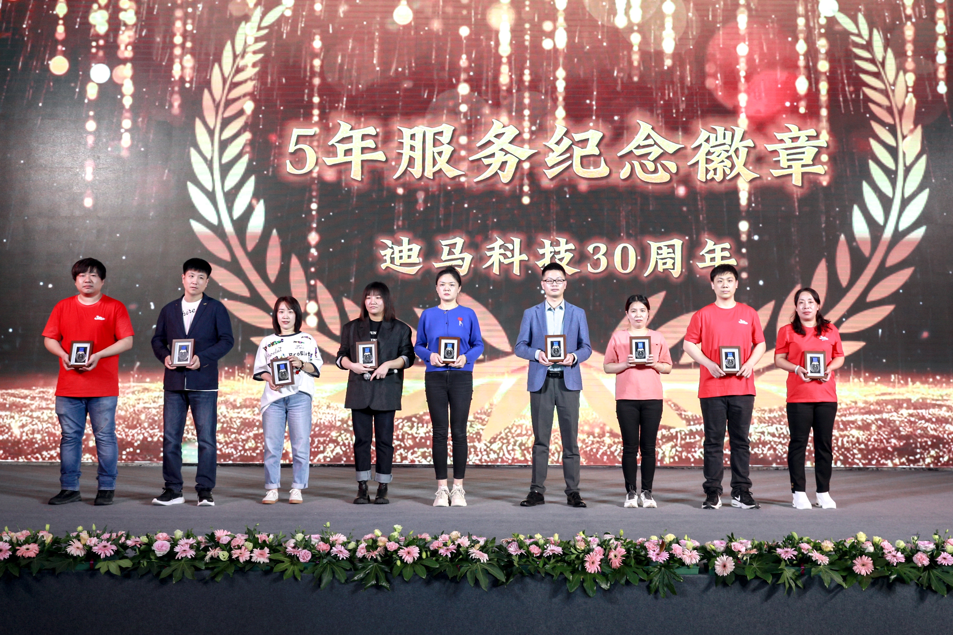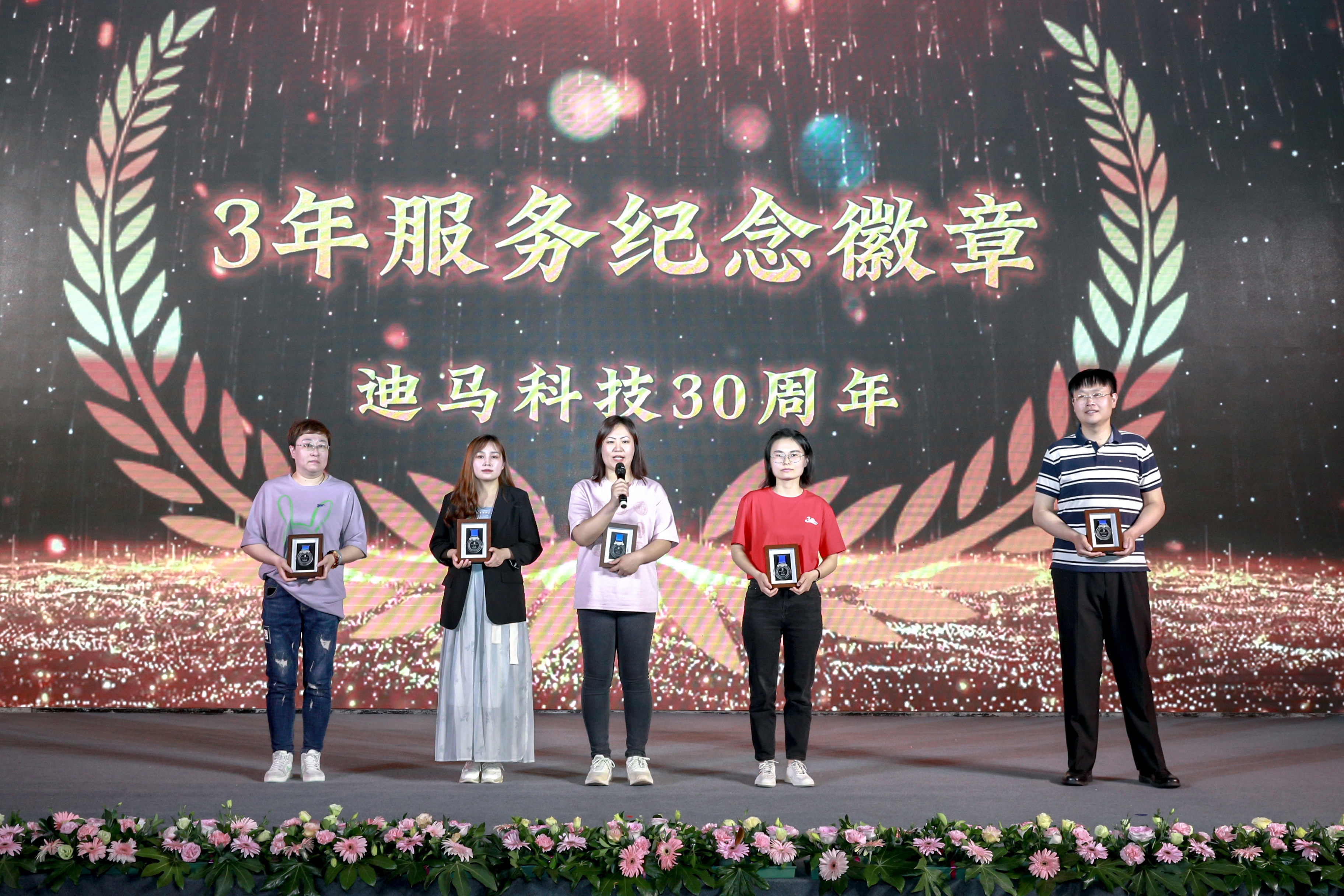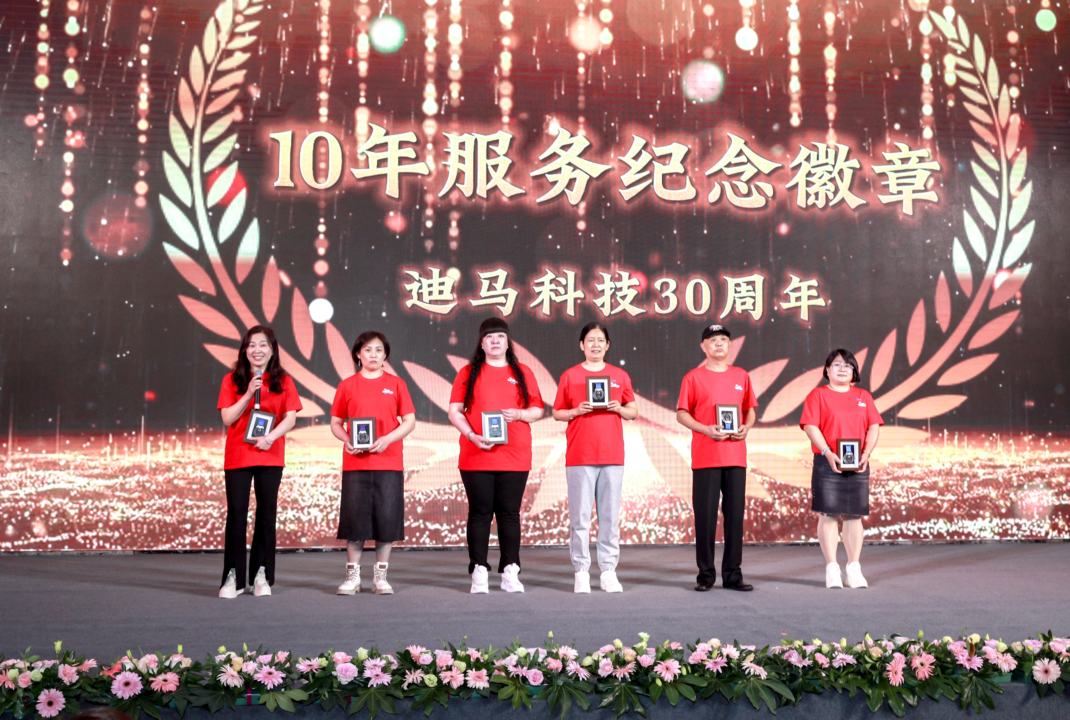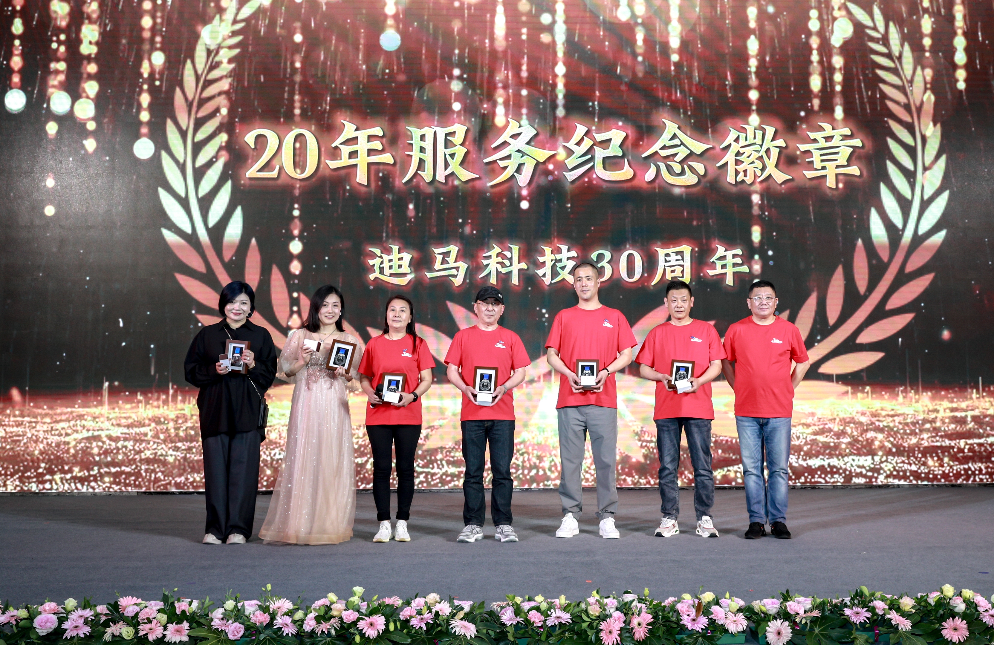 庆典节目和颁奖穿插进行。颁奖典礼上,从入职三年、五年到十年、十五年再到二十、二十五、三十年的员工比比皆是。一枚枚服务徽章记录着迪马人与公司风雨同舟。迪马科技特意为老员工们送上徽章、铂金戒指、钻石戒指、积家手表、永生花等含有特殊意义的礼品。