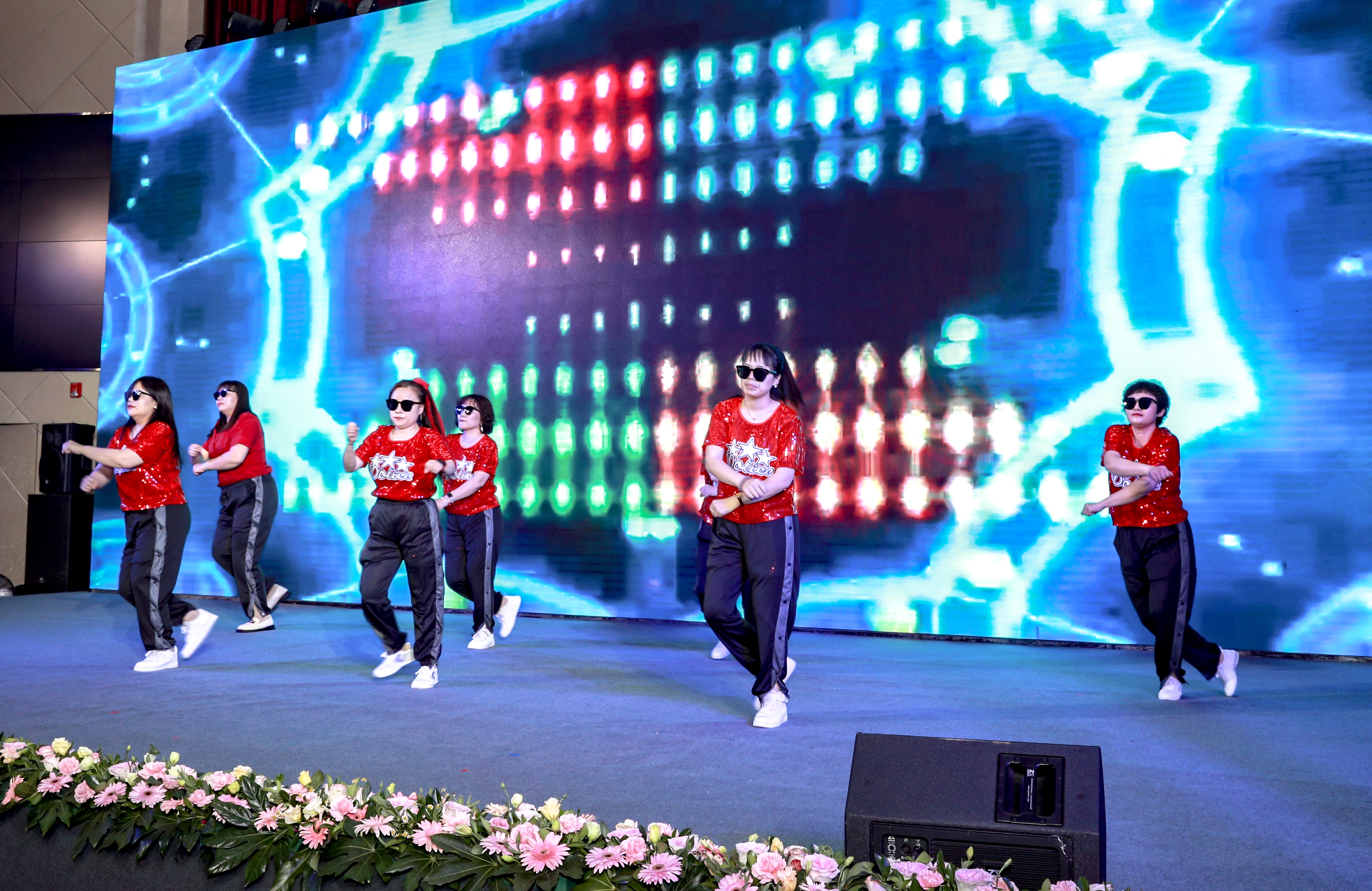 来自天津技术部和质检部的表演者们歌曲、舞蹈无缝连接。亮片衣、墨镜搭配得恰到好处。现场热闹非凡,欢呼声、鼓掌声此起彼伏。