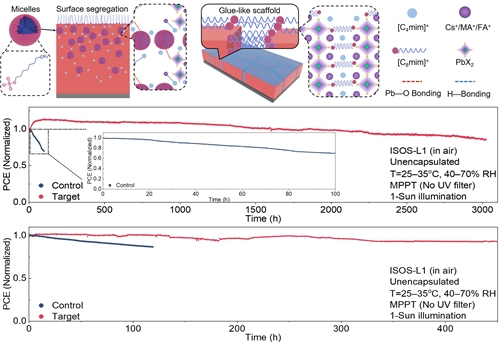 近期,中国科学院宁波材料技术与工程研究所所属新能源所硅基太阳能及宽禁带半导体团队在叶继春研究员的带领下在前期晶体硅和钙钛矿太阳电池研究的基础上,在高效稳定钙钛矿/硅叠层电池领域又取得了新的进展。该团队采用一种长碳链阴离子表面活性剂添加剂,研究发现该添加剂能通过表面自分离和胶束化以改善钙钛矿晶体生长动力学,并在钙钛矿晶界构建类胶状的支架以消除残余应力;因此,钙钛矿活性层中缺陷减少、离子迁移受抑制以及能级结构改善。最终实现了未封装的钙钛矿单结和钙钛矿/硅叠层太阳电池在最大功率点跟踪下连续光照下3000小时和450小时的运行稳定性测试中,分别保持了85.7%和93.6%的初始性能,代表了迄今为止在类似条件下报道的稳定性最佳的器件之一。