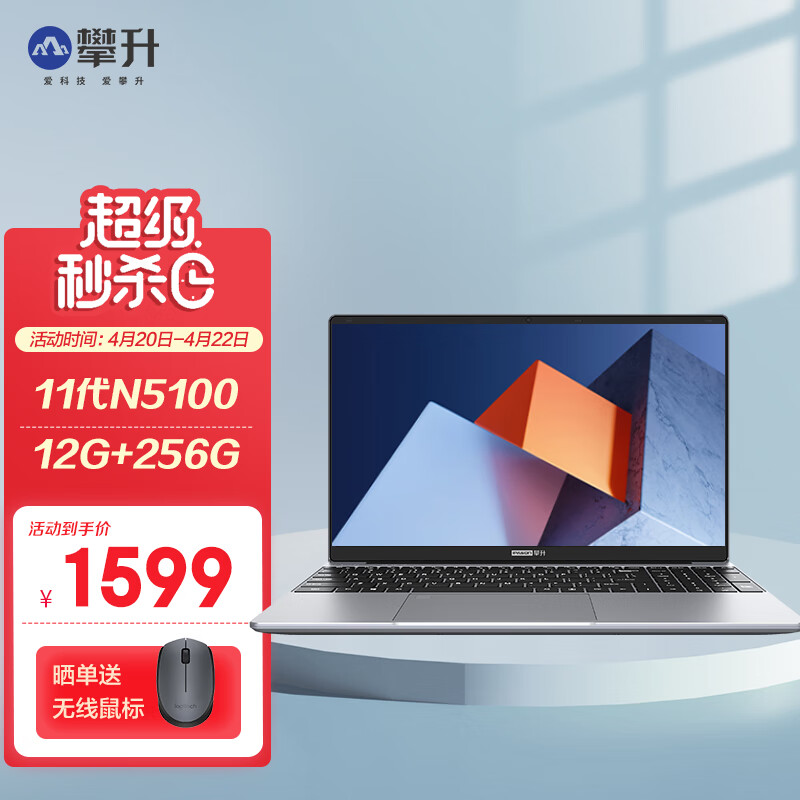 京东攀升 MaxBook 英特尔 4 核 15.6 英寸商务办公手提轻薄笔记本电脑(11 代 N5100 12G 256G)P2 2022 款 1599 元直达链接