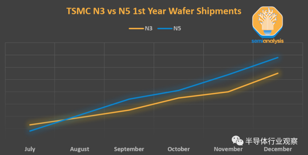 与 N5 在各自第一年的出货量相比,N3 的增长速度较慢且晶圆产量较小,这加剧了这种情况。Apple 最近的变化是仅在 Pro 型号上包含最新的芯片,并且每 N3 晶圆的 ASP 比 N5 高得多,这表明 N3 的每月晶圆(WPM)增长将落后于 N5。