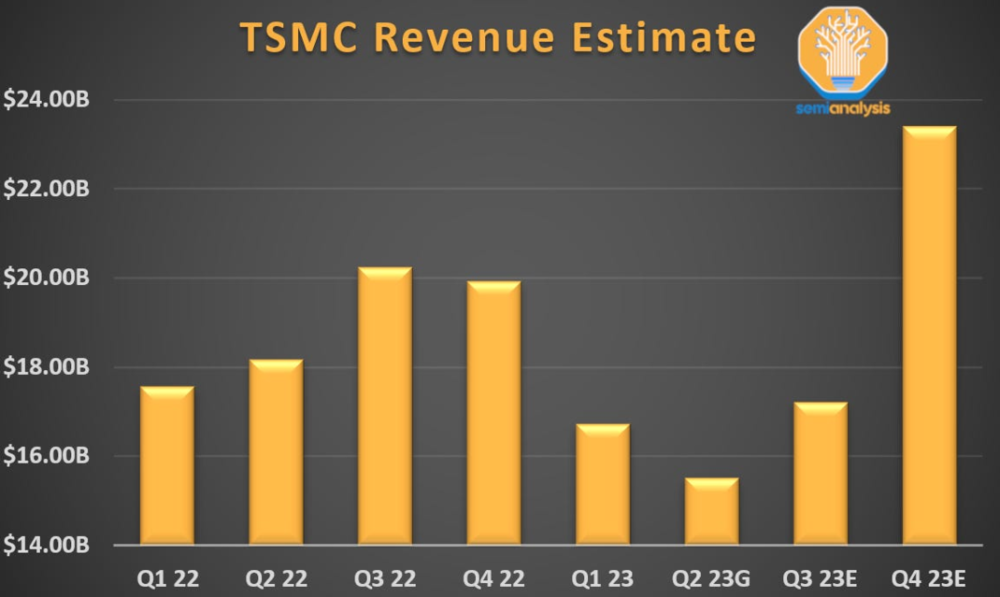 台积电该季度的主要数据是 2023 年第一季度收入下降至 167.2 亿美元,同比下降 4.8%。此外,台积电的第二季度指引暗示情况变得更糟,中点跌至 156 亿美元,同比下降 14.6%。话虽如此,台积电分享了他们的全年指导,这使我们能够回到以下估计。关于 5nm 和 3nm的表现,我们稍后会分享更多。