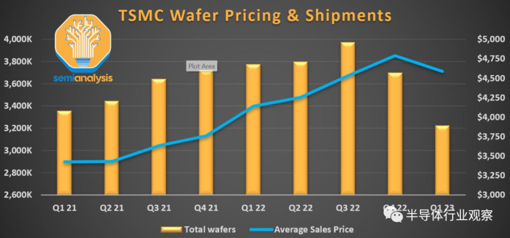 台积电多年来首次降价。尽管晶圆出货量从每季度近 400 万片下降到 2022 年第四季度的 370 万片,但定价仍在继续上涨。2023 年第一季度,台积电出货量继续下滑至 320 万片。