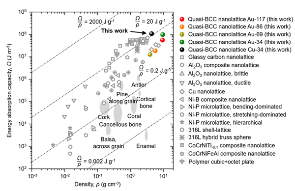 图1.金和铜准体心立方纳米梁晶格和已报道的微/纳米梁晶格力学超材料的单位体积能量吸收与密度的阿什比图