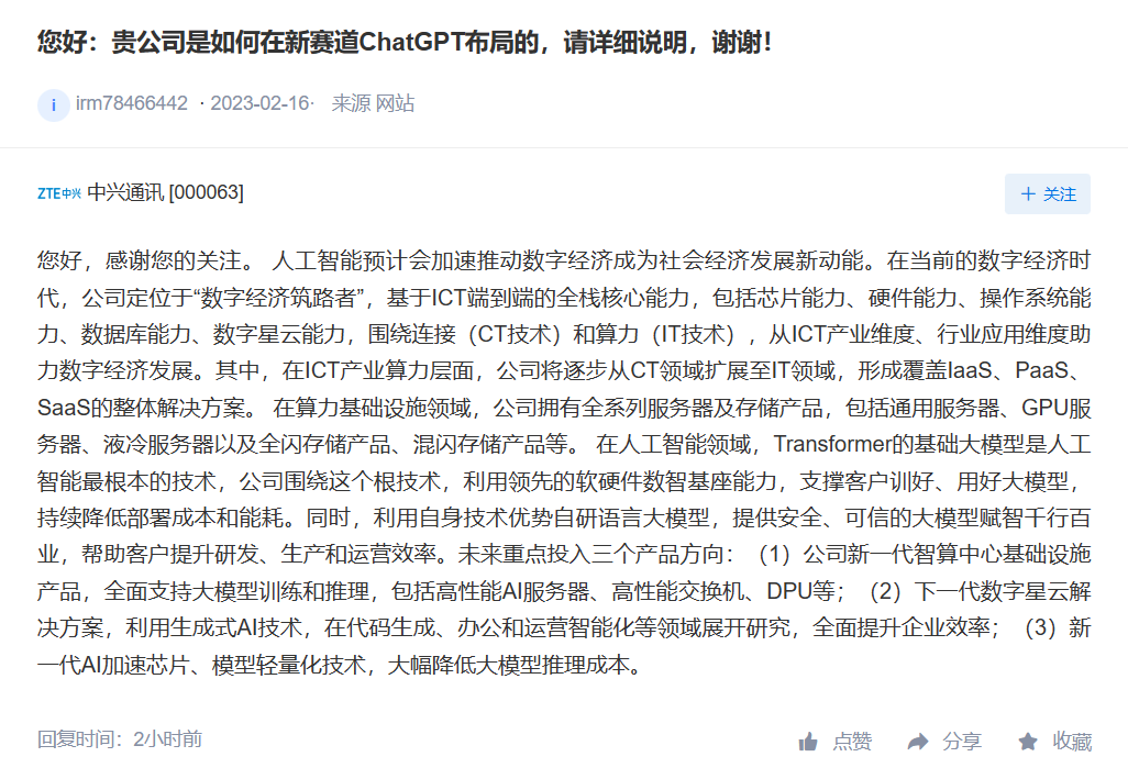 中兴通讯在互动平台表示,一直关注和重视 AI 技术的研究与应用,在网络智能化、服务器与 DPU 等算力基础设施,及 NLP(自然语言处理)、机器视觉等 AI 技术方面,长期保持投入并进行布局,多项技术和产品已经得到应用。