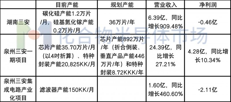 其中,湖南三安是中国首条、世界第三条碳化硅全产业链整合研发与制造平台;泉州三安半导体研发与产业化项目(一期)项目主要从事氮化镓、砷化镓和特种封装业务;泉州三安集成电路产业化项目主要从事砷化镓射频、滤波器及封装业务。湖南三安、泉州三安在2022年的产能、业绩情况如下: